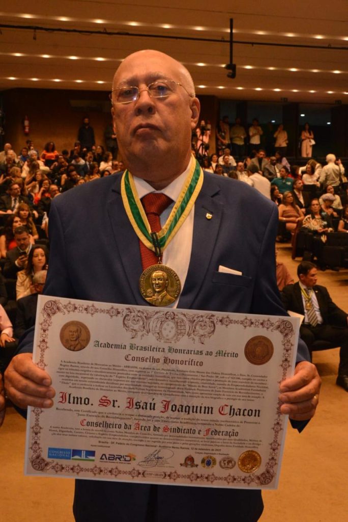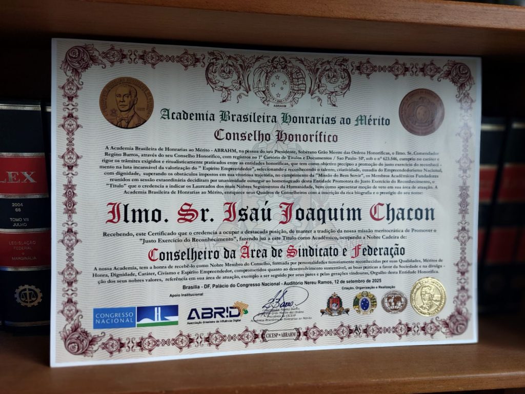 Isaú Chacon, que atualmente é presidente do Sindicato dos Securitários no Distrito Federal, presidente da Federação Nacional dos Securitários (FENESPIC) e 1º vice-presidente da Confederação Nacional dos Trabalhadores nas Empresas de Crédito (Contec), recebeu a distinção como Conselheiro na área de Sindicato e Federação. A homenagem reconhece sua trajetória de dedicação à defesa dos trabalhadores, seu compromisso com a representatividade e sua atuação no fortalecimento do sindicalismo em âmbito nacional.