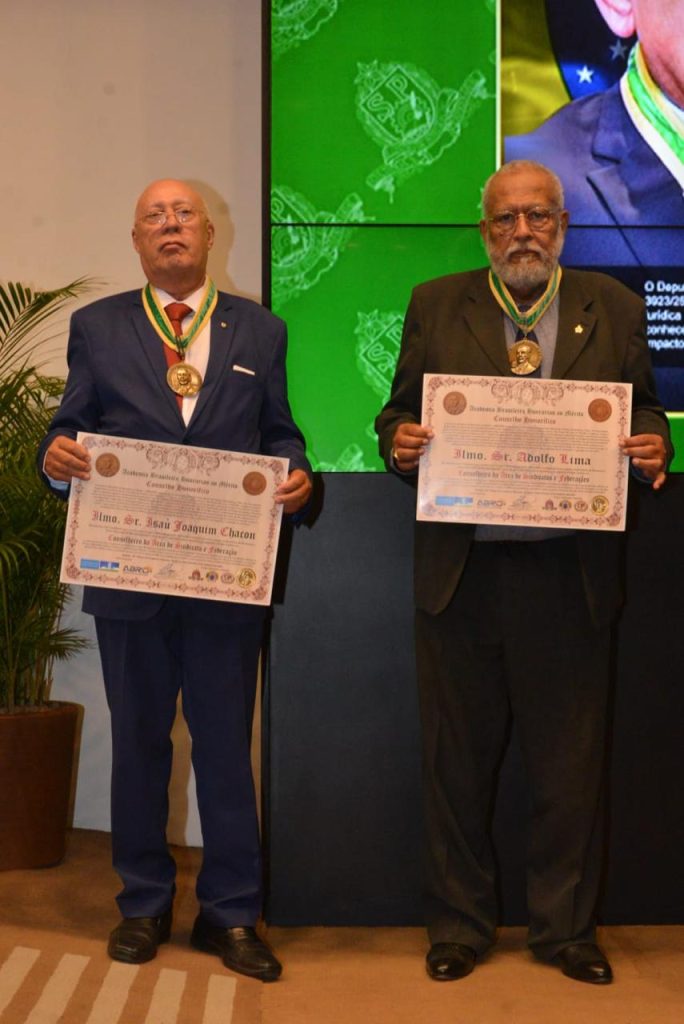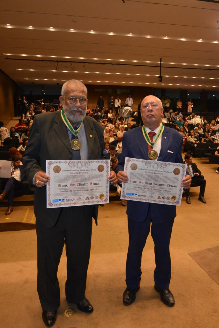 No último dia 12 de setembro, os líderes sindicais Isaú Joaquim Chacon e Adolfo Lima, presidente do Sindicato dos Securitários do Rio de Janeiro, foram homenageados pela Academia Brasileira de Honrarias ao Mérito, em solenidade realizada no Auditório Nereu Ramos, no Congresso Nacional, em Brasília.